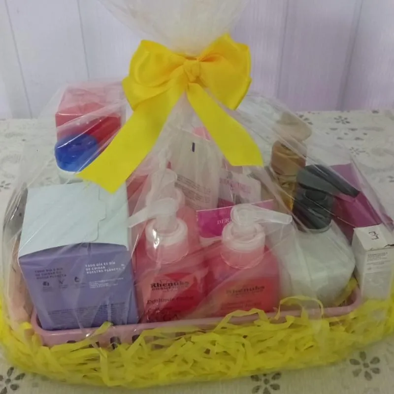 Uma cesta contendo produtos da Natura,Boticário,Avon e outros.