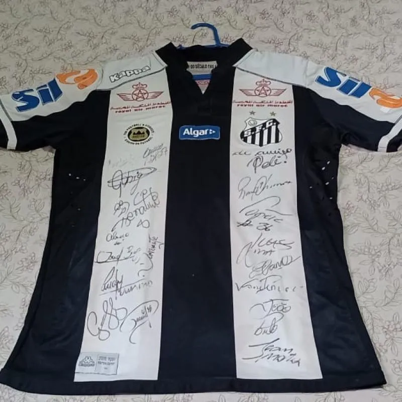 📜 Autógrafos confirmados na camisa: Pelé, Rodrigão, Bruno Henrique, Gabigol, Renato, David Braz, Dorival Jr., Lucas Veríssimo, Gustavo Henrique, Daniel Guedes, Ricardo Oliveira, Copete, Lucas Lima, Elano, Vanderlei, João Paulo e Jean Mota.