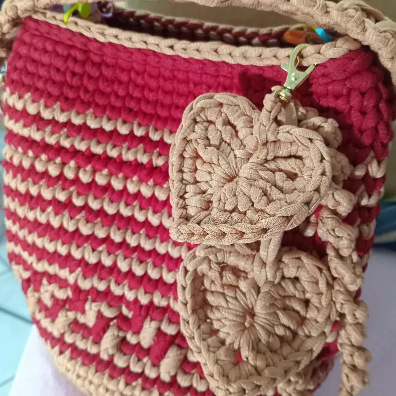 Bolsa em fio de malha Fischer Premium. Medindo 26 cm de base circular, largura 27 cm e altura 26 cm.