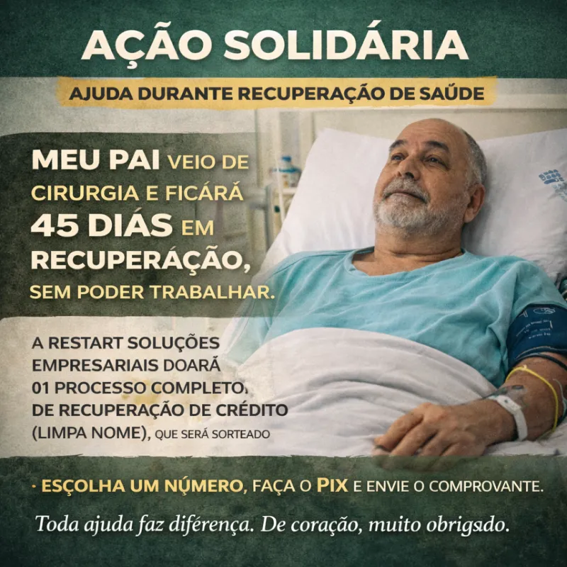 A Restart Soluções Empresariais está promovendo esta ação solidária para ajudar um pai de família que passou por cirurgia e precisará ficar aproximadamente 45 dias em recuperação, sem poder trabalhar neste período.