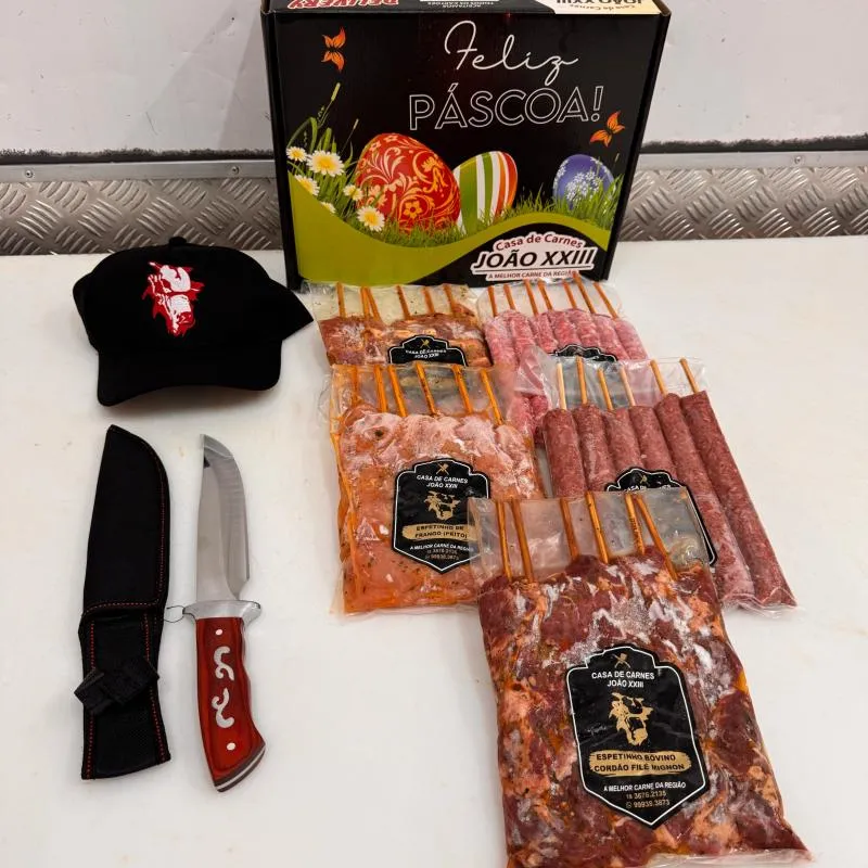 UM KIT CHURRAS+FACA ARTESANAL+BONÉ PERSONALIZADO