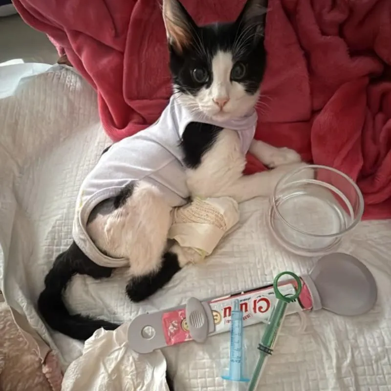 Chumbinho é um gatinho abandonado que levou um tiro de espingarda com aproximadamente 30 dias de vida. A bala de chumbinho se alojou na coluna, fazendo com que ele perdesse o movimento da cauda e de uma das pernas. Ele precisa urgente fazer um exame de tomografia para localização do chumbinho para planejamento da cirurgia e retirada do projétil.
