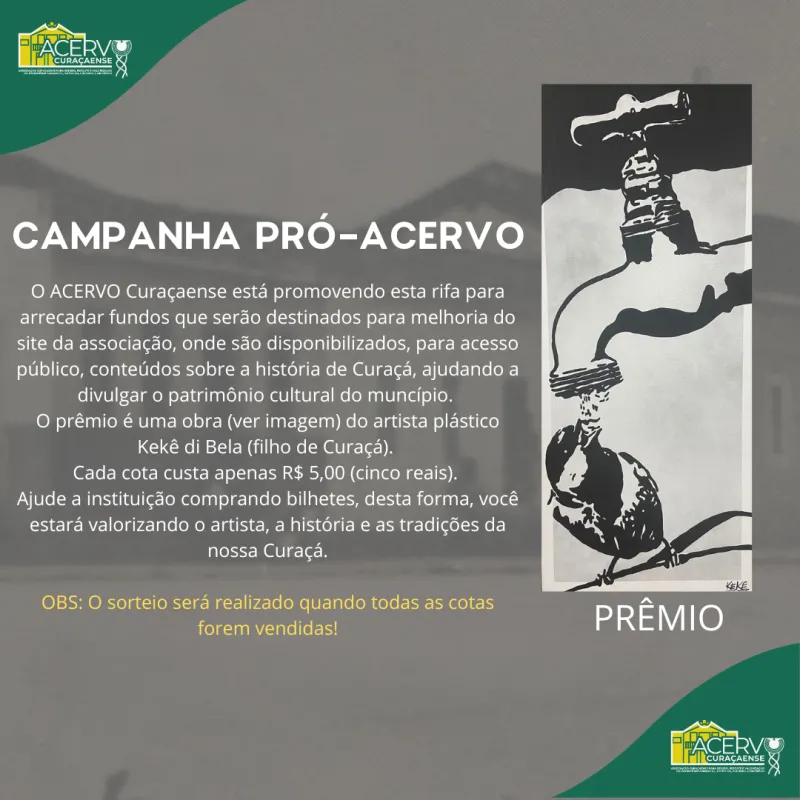 ACERVO Curaçaense está promovendo esta rifa para arrecadar fundos que serão destinados para melhoria do site da associação, onde são disponibilizados, para acesso público, conteúdos sobre a história de Curaçá, ajudando a divulgar o patrimônio cultural do muncípio.