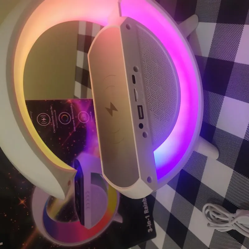 1Caixa de som, com entrada USB , cartão de memória, e entrada Aux, Luminária com Carregamento por indução . No Valor de 200,00