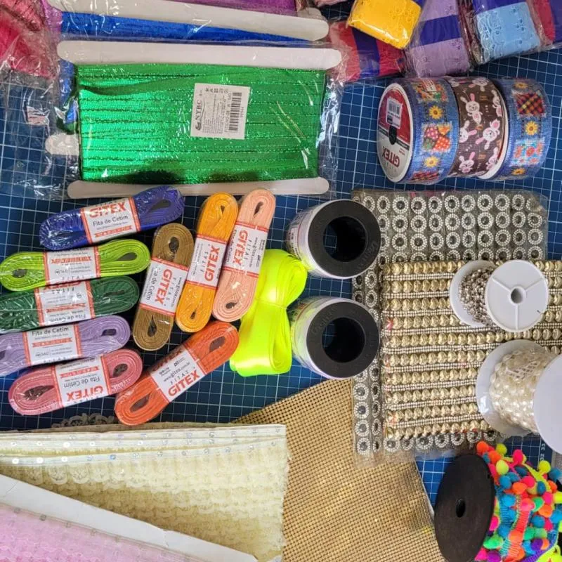 Caixa com 36 itens sendo fitas de cetim, rendas, manta strass, manta chatos e bordado inglês.
