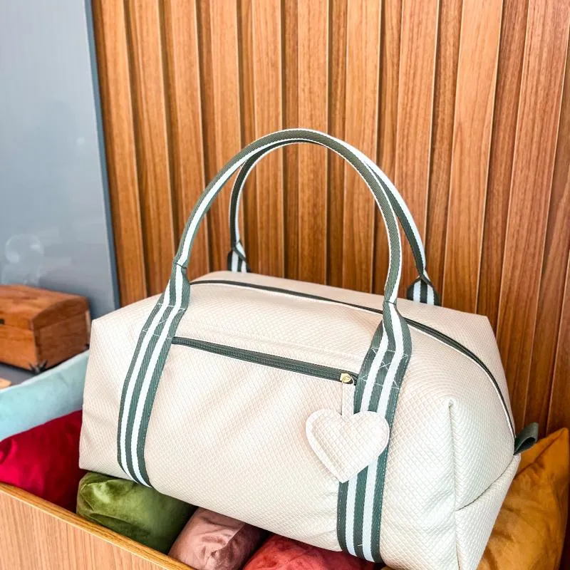 Bolsa para férias e fim de semana, resistente a água, espaçosa e durável, marfim com detalhes verdes, acolchoamento interno, múltiplos compartimentos, alça de ombro ajustável, perfeito para viagens casuais.