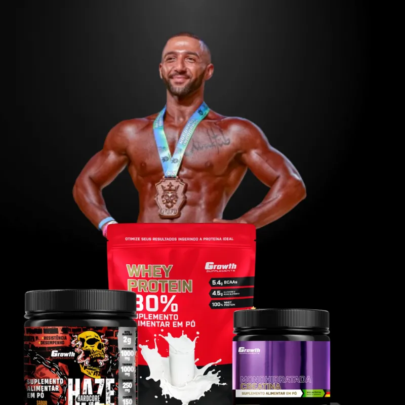 1º Lugar - Kit Growth 1 Whey, 1 Creatina e 1 Pré Treino. (Da foto)