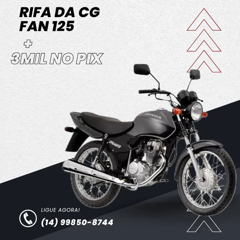 MAIS UMA RIFA DA 125, DESSA VEZ COM MAIS CHANCES DE GANHAR, COM APENAS 25 REIAS VOCE CONCORRE A UMA CG FAN 125 E MAIS 6 BILHETES PREMIADOS DE 50P REIAS NO PIX CORRE QUE SO TEM APENAS 500 NUMEROS !