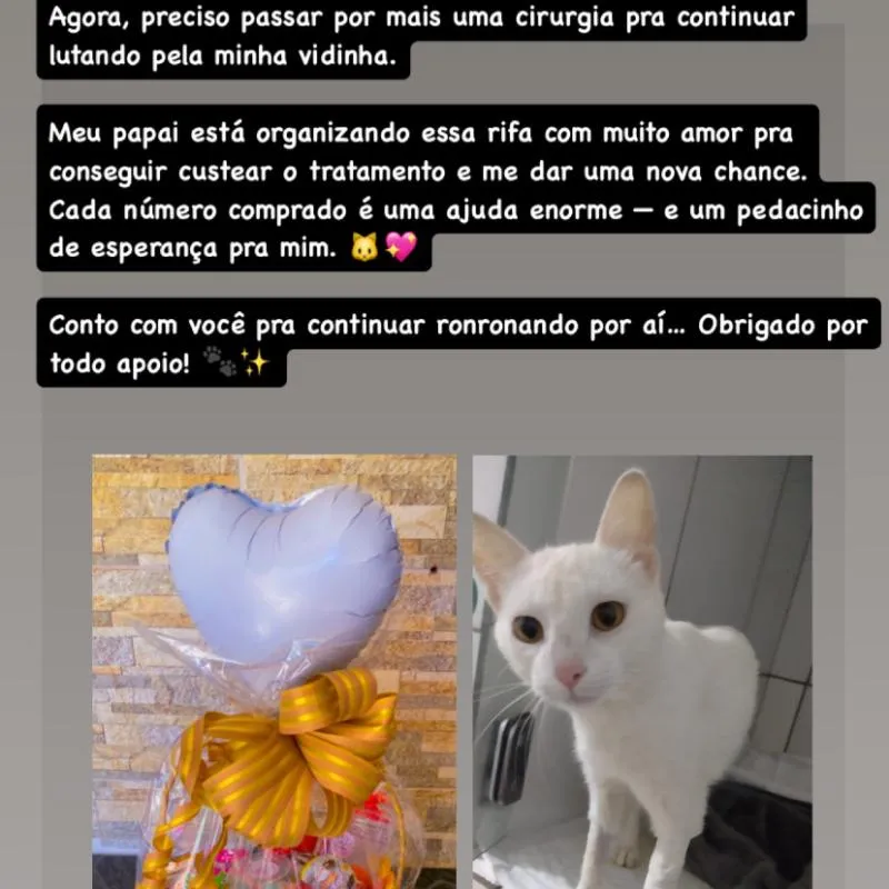 Meu papai está organizando essa rifa com muito amor pra conseguir custear o tratamento e me dar uma nova chance. Cada número comprado é uma ajuda enorme — e um pedacinho de esperança pra mim. 🐱💖