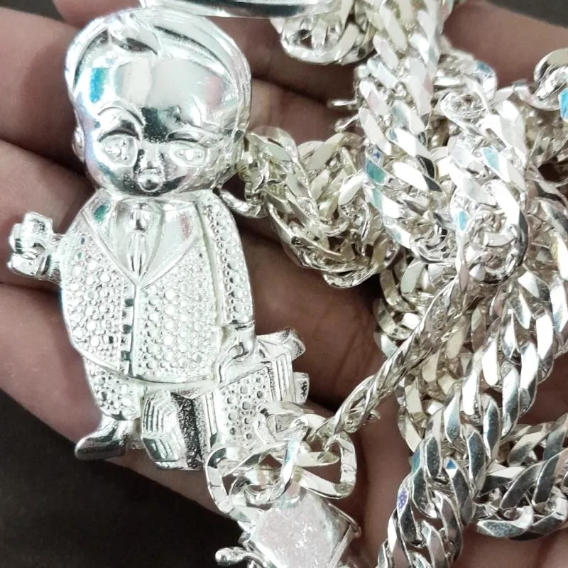 Corrente de prata 925, elo duplo, 8mm, 70cm, brilha muito, joia semi nova, com o pingente poderoso chefinho, aproximadamente 65.5g a peça, por apenas 20.00$ pode ser adquirida pelo sorteio.
