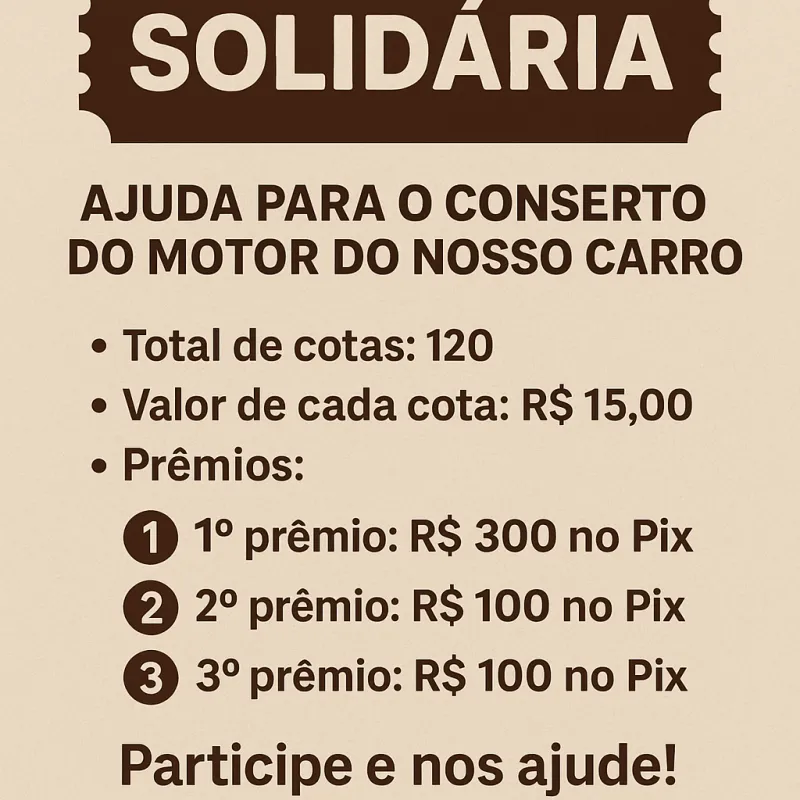 🎉 Rifa Solidária – Ajuda para o Conserto do Motor do Carro 🎉