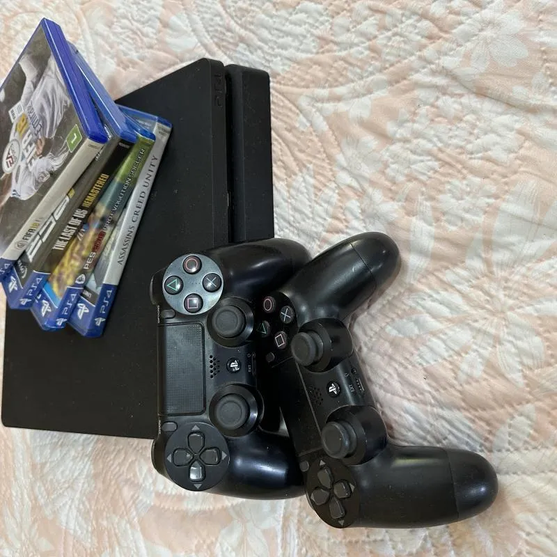 UM PS4 COM DOIS CONTROLES E JOGOS
