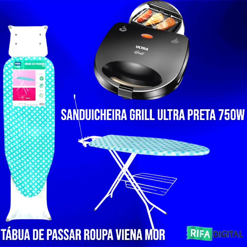 Com R$10 você passa a concorrer a uma Tábua de passar roupa Viena mor e Sanduicheira Grill Ultra S13 - Preto. Venha aproveitar!