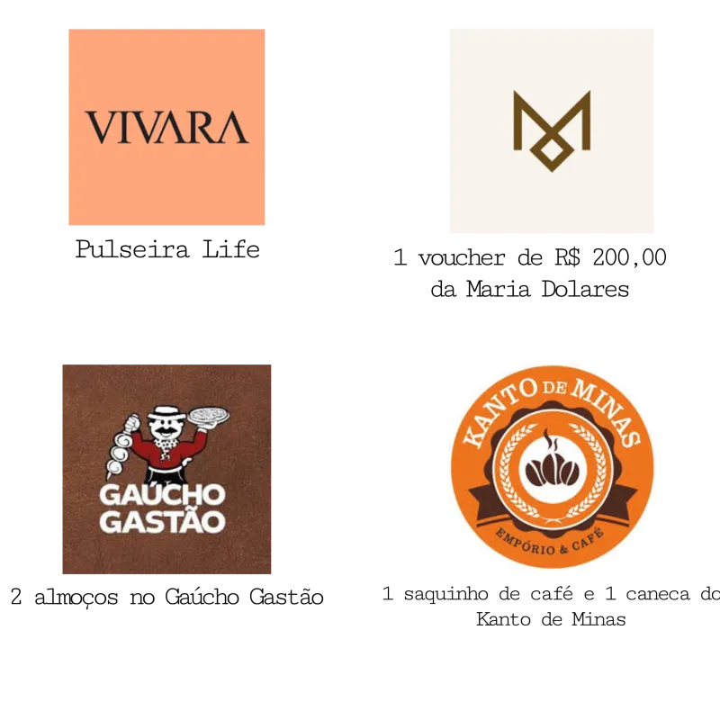 - Os prêmios são: 1º lugar: Pulseira Vivara Life, 2º lugar: Voucher de R$200,00 na Maria Dolores, 3º lugar: 2 almoços no Gaúcho Gastão e 4º lugar: um saquinho de café e uma caneca da loja Kanto de Minas.