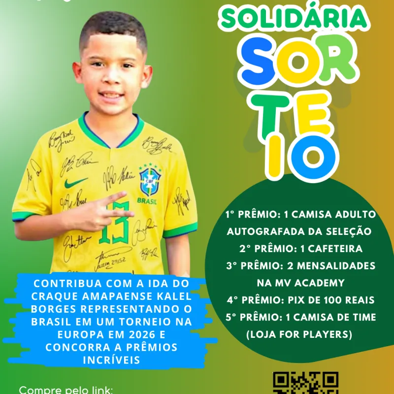 Objetivo: Apoiar as despesas do Jovem talento amapaense Kalel Borges que foi convocado para representar o Brasil em torneio internacional de Futebol na Europa em Jul de 2026; família faz Rifa Solidária para a viagem