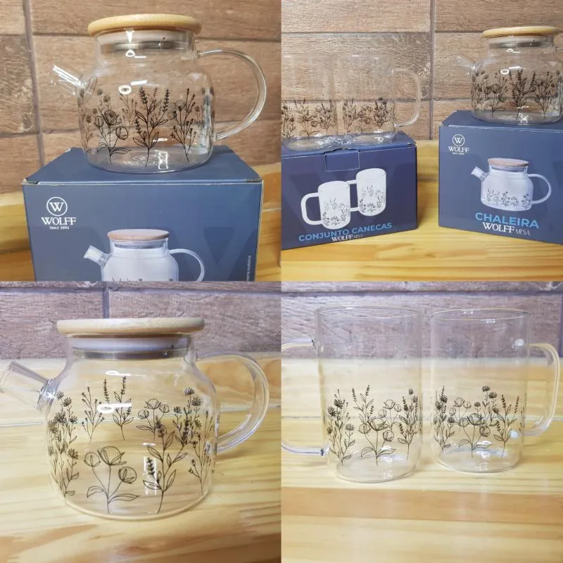 Lindo kit que contém: 1 chaleira de vidro com tampa de bambu com estampa de flores de 600ml e 2 canecas de vidros (280ml cada) com a mesma estampa da chaleira. Ambas da marca WOLFF.