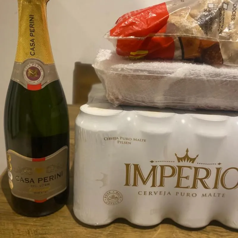 Uma caixa de Itaipava, um Espumante Casa Perini e 100 salgadinhos.