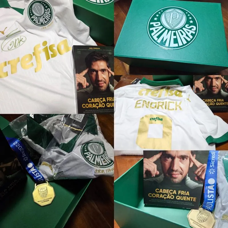 O ganhador receberá um kit com 1 caixa personalizada do Palmeiras, 1 camisa autografada pelo Endrick, 1 livro do Abel Ferreira autografado e 1 medalha do campeão paulista 2022.