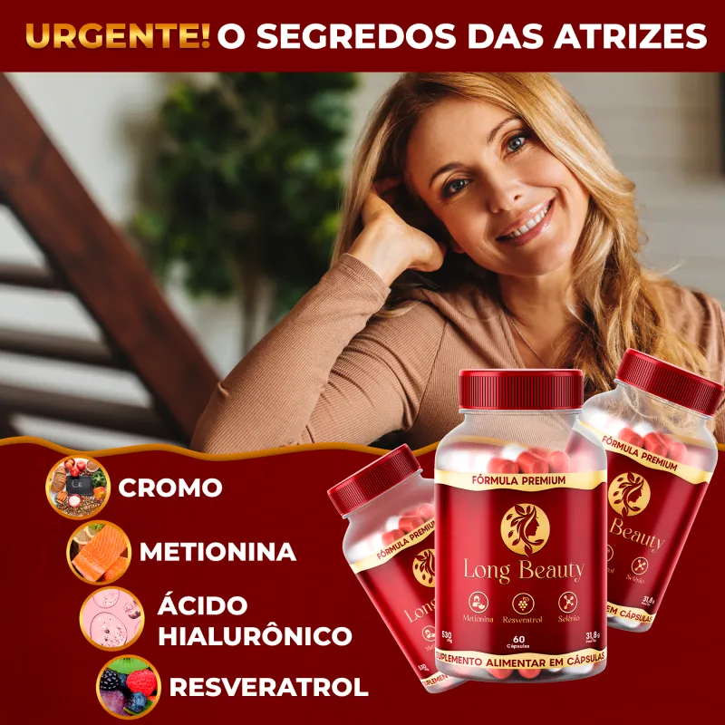 Conheça o LONG BEAUTY, o tratamento que auxilia no crescimento capilar, deixa suas unhas fortes e sua pele mais bonita!!! Fórmula única que trata de dentro pra fora!!! Contém Cromo, Metionina, Ácido Hialurônico e Revesratrol.