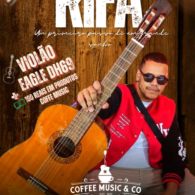 Rifa de um violão semi novo Modelo Eagle DH69 todo regulado e restaurado pela Luthieria Coffe music avaliado em mais de 1.000 reais + 100 reais em produtos coffe music.