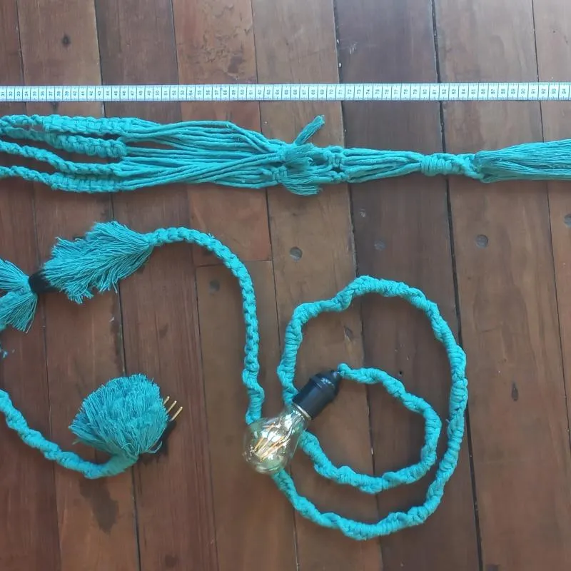 1º lugar - 1 pendente/luminaria em macramê + um suporte de plantas em macramê, abos azuis