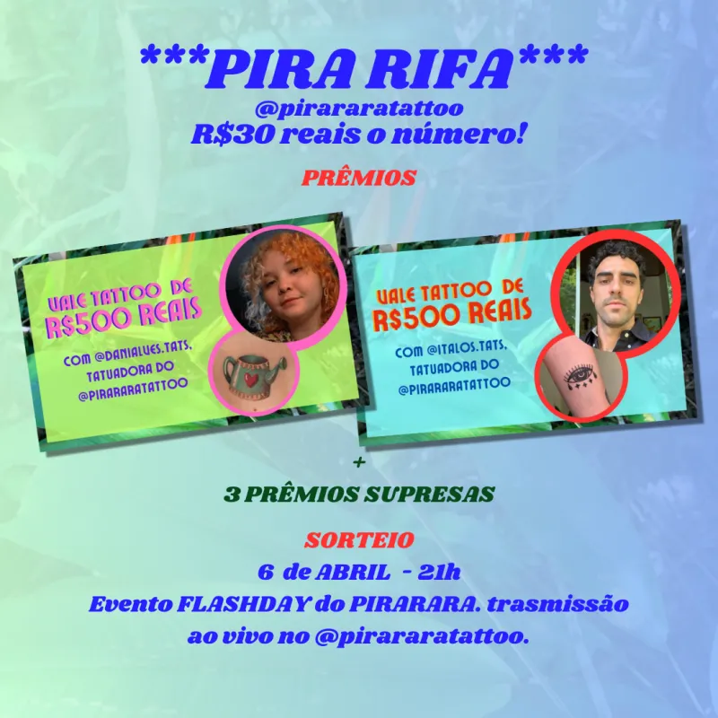 Esses sorteios serão feitos no dia 6 de abril durante nosso primeiro FLASHDAY DO PIRA deste ano. Para aqueles que não poderão participar do sorteio e do evento, iremos fazer uma live no perfil do instagram @pirararatattoo. Caso você também não consiga assistir a live, não se preocupe. Nós entraremos em contato para lhe premiar.
