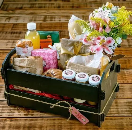 Cesta de café da manhã com 32 intens Gourmet, ( chocolates, guloseimas, frutas, pães, bebidas, lembranças, pelúcia e mais um buquet com 06 rosas brancas colombiana e 06 rosas vermelhas colombiana + 01 Vale almoço com acompanhante no Restaurante de sua preferência até um valor de $300,00