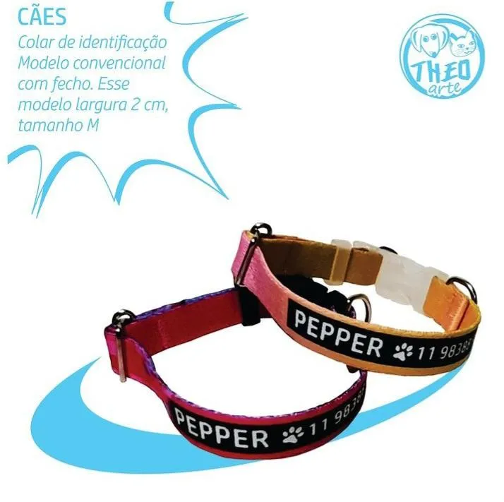 Coleira com nome do pet e telefone do tutor estampados.