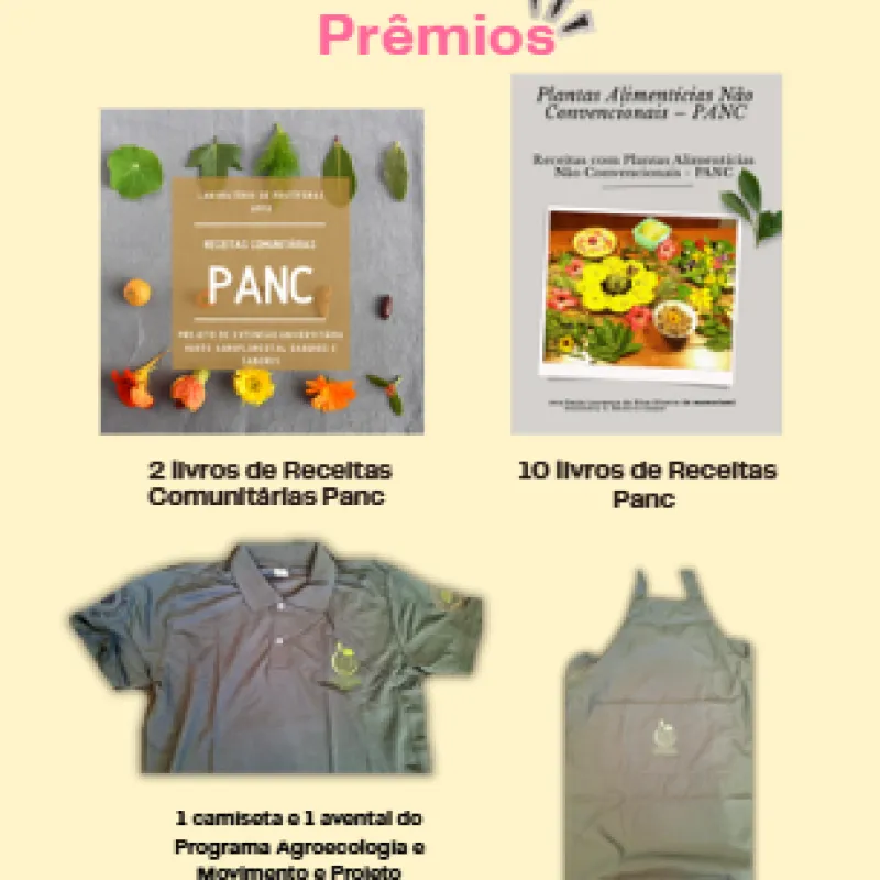 Prêmios: 1 camiseta, 1 avental do Programa Agroecologia e Movimento e Projeto Horto Agroflorestal Sabores e Saberes. 2 livros de Receitas Comunitárias Panc e 10 livros de Receitas Panc.
