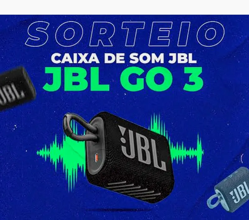 Prêmio incrível sendo uma Nova caixa de som JBL GO 3, com excelente bateria, resistente a respingos de água e poeira, na cor preto, linda de última geração.