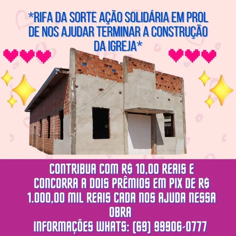 *Ajude-nos a arrecadar fundos financeiro para nos ajudar a terminar a construção de nossa igreja e tenha a chance de ganhar a dois prêmios incríveis no valor em pix na nossa rifa! Contribua com apenas R$ 10,00 reias e concorra a dois prêmios em pix de R$ 1.000,00 mil reais cada*