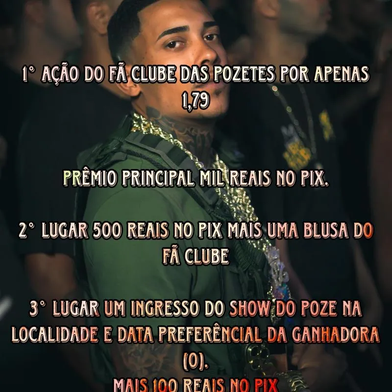 3° LUGAR UM INGRESSO DO SHOW DO POZE EM ALGUM LUGAR E DATA QUE A PESSOA ESCOLHER MAIS 100 REAIS NO PIX E UMA BLUSA DO NOSSO FÃ CLUBE