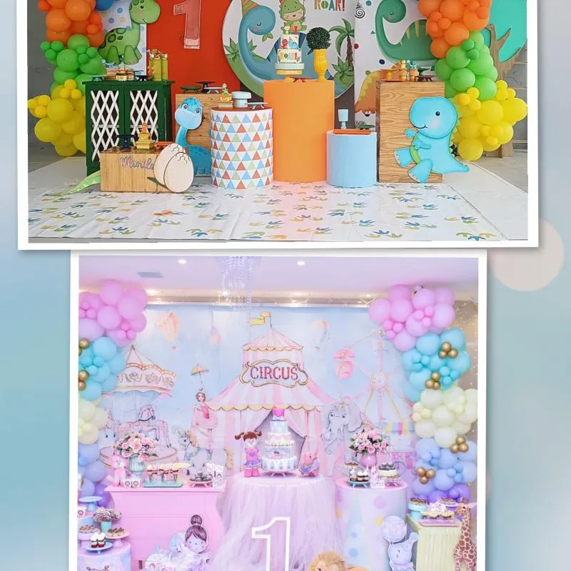 1 Uma Decoração Dino Baby ou Circo Rosa. Com Painéis, mobílias, bandejas, jarros, tapete, escadinha, acessórios do tema.