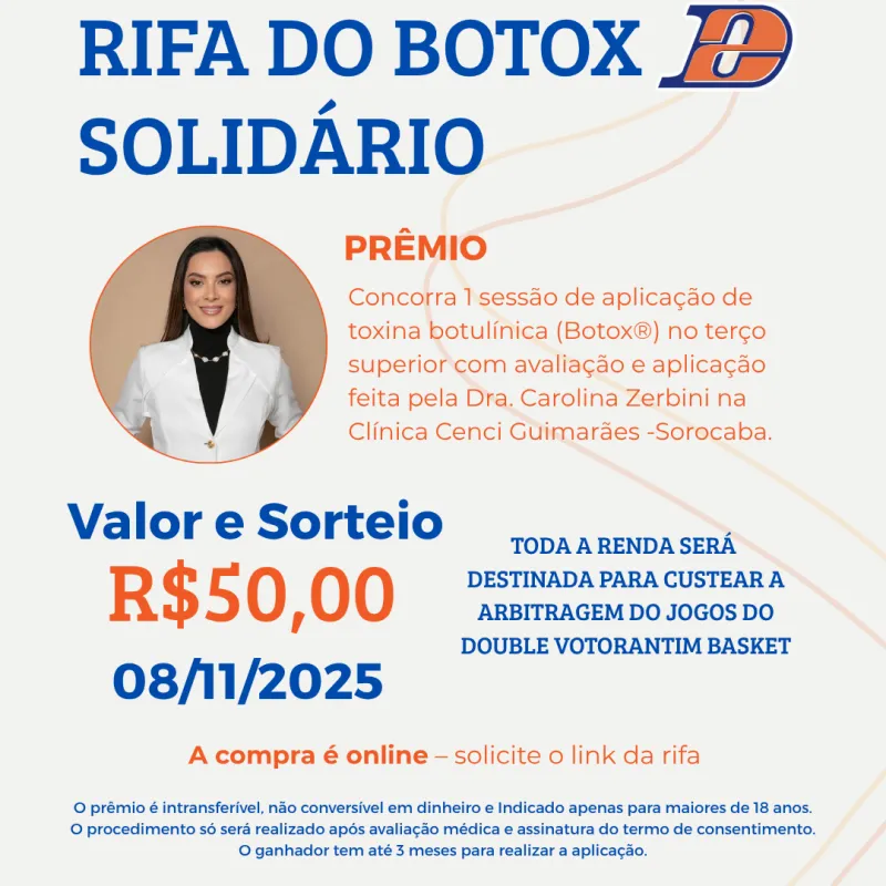 Concorra a 1 sessão de aplicação de toxina botulínica (Botox®) no terço superior com a Dra. Carolina Zerbini – CRM-SP 110339 e ajude o Double Votorantim Basquete a continuar crescendo! 🏀💉
