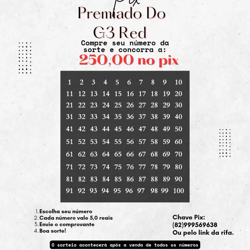 Rifa do Gol G3 Red SORTEIO DE 250,00 REAIS NO PIX.