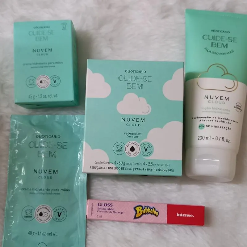 Contendo: Loção hidratante 200ml, creme hidratante para mãos + refil, caixa de sabonetes (4 unidades), brilho labial Intense Bubbaloo de morango.