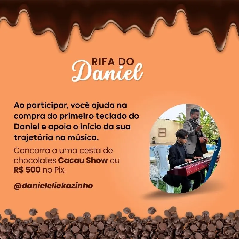 Daniel tem 11 anos e carrega na música uma forma bonita de expressar sua fé e levar paz a quem o ouve. Ele toca na igreja com carinho e dedicação, e agora sonha em ter seu primeiro teclado para continuar crescendo nesse dom tão especial. Esta rifa tem como propósito ajudar na compra do teclado e apoiar o caminho que ele vem construindo na música.