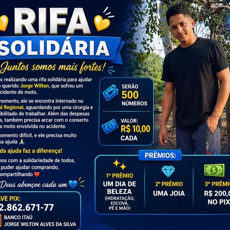 Estamos realizando uma rifa solidária para ajudar o nosso querido Jorge Wilton, que sofreu um grave acidente de moto.