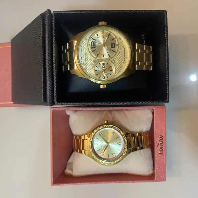 São dois relógios novos, um feminino e o outro masculino. Ambos são resistente a 50 metros de profundidade (5 atm)