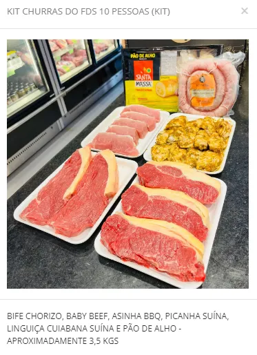 (Contendo bife chorizo, babu beef, asinha BBQ, picanha suína, linguiça cuiabana suína e pão de alho. - APROXIMADAMENTE 3,5 KGS)