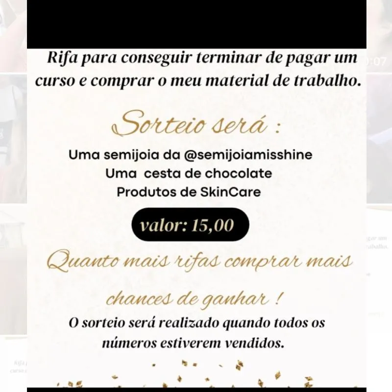 Fala gente !! Acabei de criar uma rifa para me ajudar a comprar o restante dos meus matérias de trabalho. Estou também pagando uma pessoa para finalizar a criação dos meus cursos de estética on-line e lançá-los a venda! Valendo uma semijoia, uma cesta de chocolate e produtos de skincare.