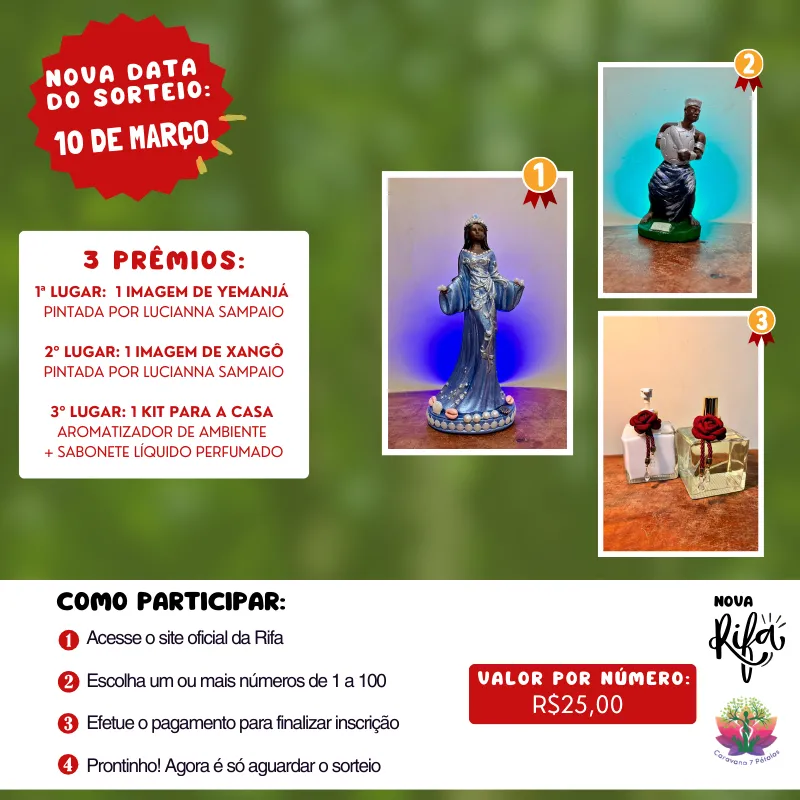Nessa rifa, teremos 3 números sorteados, ou seja, 3 chances de você ser contemplado e levar para casa esses itens especiais, que foram preparados e selecionados com muito carinho e axé.