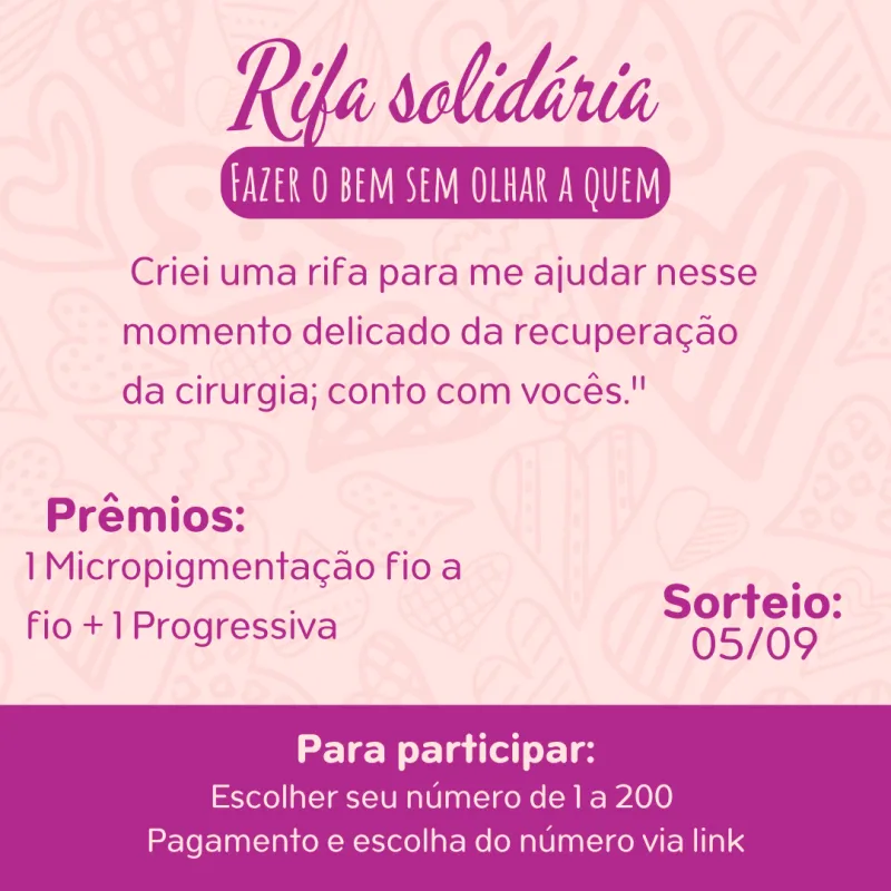 📌 Esta rifa tem como objetivo arrecadar fundos para apoiar a recuperação da cirurgia contra o câncer de colo do útero.