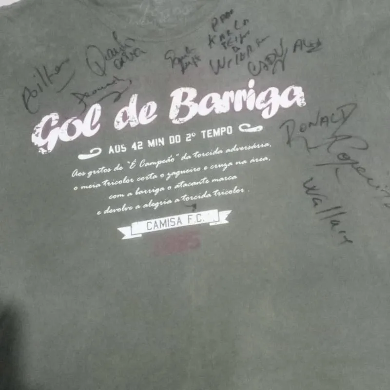 No entanto, agora é necessário ampliar esse leque. Peço a ajuda da minha amada torcida Tricolor para vencer essa batalha. Essa camisa é uma relíquia, faz parte da nossa história, conta um dos momentos mais importantes e gloriosos que vivemos no Maracanã. Não existe Tricolor em toda terra que esquecerá os 42 minutos do segundo tempo. O GOL de BARRIGA. A camisa é autografada por todo o elenco de 1995.