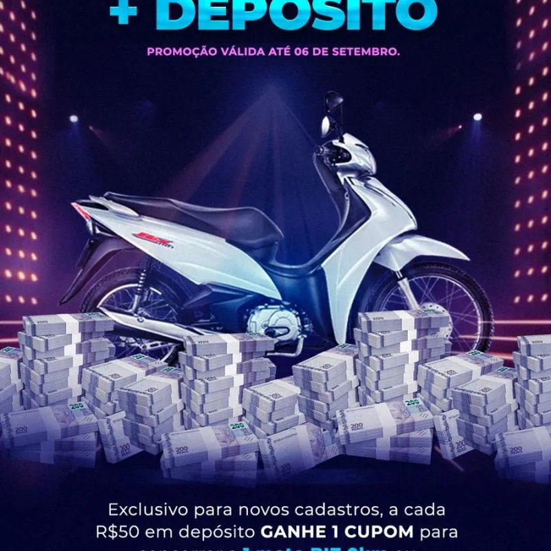 A cada R$50 reais em depósito você ganha um cupom para concorrer a uma BIZ 0KM ou um PIX de DEZ MIL REAIS!