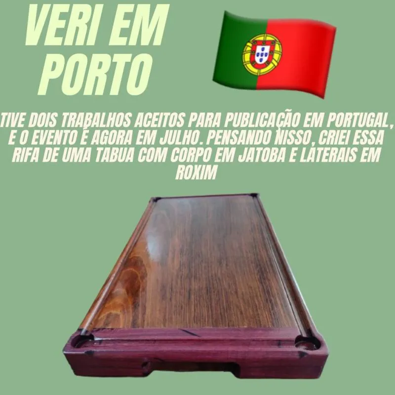 Há poucos dias recebi a noticia da aprovação de dois trabalhos para minha primeira publicação internacional na Universidade de Porto (Portugal). O evento da universidade em que os dois trabalhos (um sobre planejamento de cidades sustentáveis e outro sobre a logística reversa de embalagens plásticas) acontecerá de 08 a 11 de julho. Já tenho o mais difícil: as passagens e hospedagem. Agora, estou levantando recursos para os demais gastos. Dessa forma, estou fazendo essa rifa de uma tábua com corpo em jatobá e laterais em roxim.
