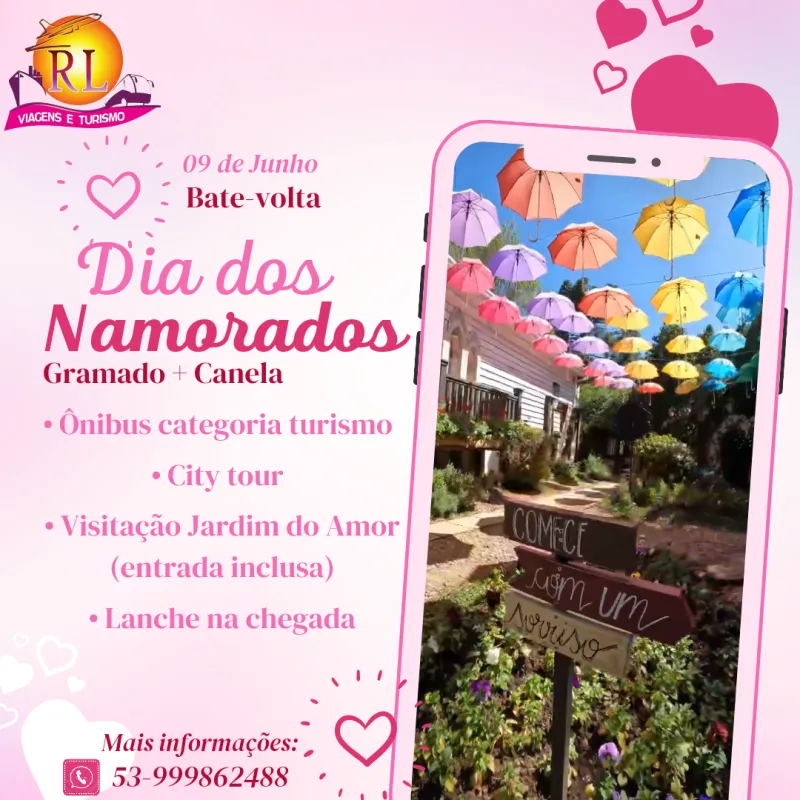 Sorteio de 1 Viagem para Casal - Gramado + Canela bate-volta com saída dia 09/06/2024. Transporte + lanche na chegada + entradas Parque Jardim do Amor. Não inclui refeições.