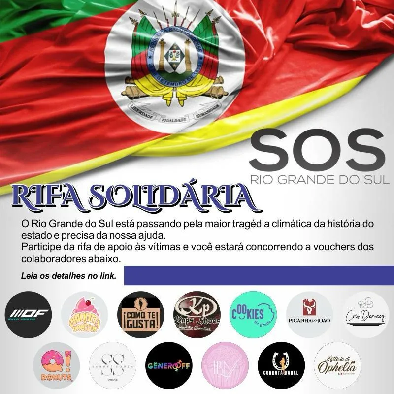 Com muita esperança e muita solidariedade que criei essa rifa solidária em parceria com o: Of Auto Posto, Picanha do João, Chiquita Docitos, Kaps Shoes, Brigadeiros da Maria, Q! Donuts, Cookies da Grade, Conduta Rural, Sandra Souza Beauty, Latteria Di Ophelia, Gênero Of, Cris Demacq e Como Te Gusta, todos os parceiros disponibilizaram vouchers, para aqui arrecadarmos fundos a serem enviados ao Rio Grande do Sul.