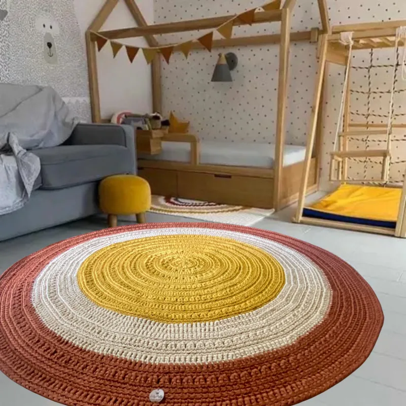 ⚠️Tapete artesanal confeccionado na técnica clássica do crochê com fio náutico 8mm, tons açafrão, gergelim e cacau. Os fios náuticos são produzidos com matéria-prima de alta qualidade trazendo conforto e estrutura na peça. É um tapete indicado para áreas externas e internas, casas de praia, gourmet, cozinha, área de lazer, dentre outros ambientes.