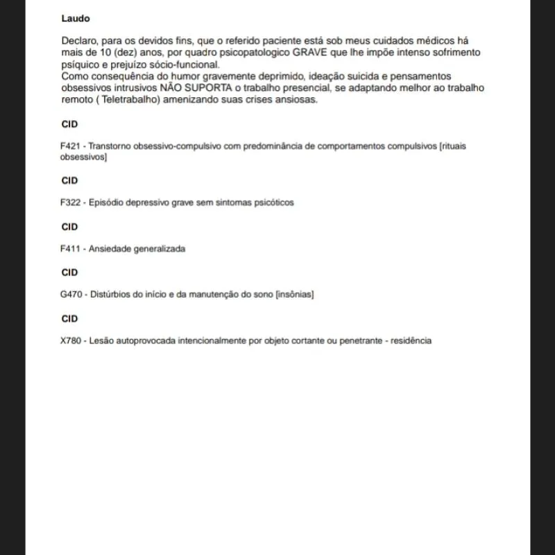 - Depressão Grave com pensamentos suicidas e automutilação.